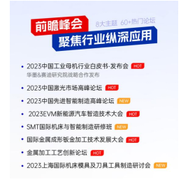 2023華機展·上海立足中國工業母機行業縱深應用,錨定智能制造、激光產業、新能源汽車、鈑金加工、模具刀具、金屬材料、工廠數字化升級等8大主題,隆重舉辦60+熱門會議論壇。年度盛典、行業報告、白皮書發布,稀缺的行業資源匯聚于一處,為企業戰略發展指明方向,為制造業未來奔騰點亮明燈。