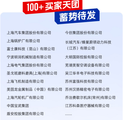 本屆展會將全面展示應用于石油化工、航空航天、電子3C、有色金屬、環保設備、紡織機械、食品機械、通用機械、儀器儀表、工量刃具、模具制造、家具制品、汽摩配件、電動工具、金屬冶煉、物流運輸、機械制造、生物科技、新能源新材料、農業機械、機床工具、家用電器、汽車制造、醫療器械等24大行業的新產品、新技術及新解決方案,100+買家天團已整裝待發,將組團赴會!