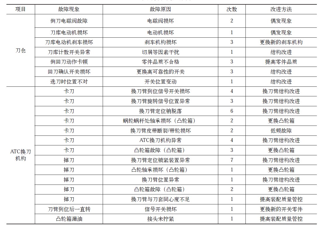由表1統計可知,刀庫自身問題引起的故障總數為52起,占比41.93%,在刀庫故障總量中占據了最大份額。由此可見,刀庫自身可靠性的提升將極大促進機床整體可靠性的提升。上述故障中,針對刀倉部分主要需要改進刀倉上信號開關的安裝、增加鎖緊結構,同時需要改進帶動刀倉旋轉的電動機上的剎車裝置;ATC機構改進點較多,主要故障點為換刀機構和凸輪箱,根據故障次數,建議刀庫廠家將對刀臂和凸輪箱進行整體考量,從結構上更換品牌。