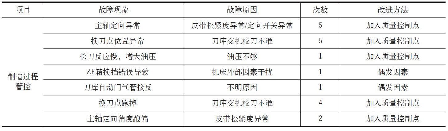 由表3可知,機床制造過程中質量管控不到位引起的故障總數19起,占比15.32%。工藝和質保有必要加強對主軸箱上帶輪松緊度以及管路接線的指導與檢驗。售后服務部門在安裝刀庫和垂直軸驅動電動機后,需要重新校準換刀點,表3中由于第二參考點位置變動引起的卡刀現象較多,因此需要予以特別的重視。