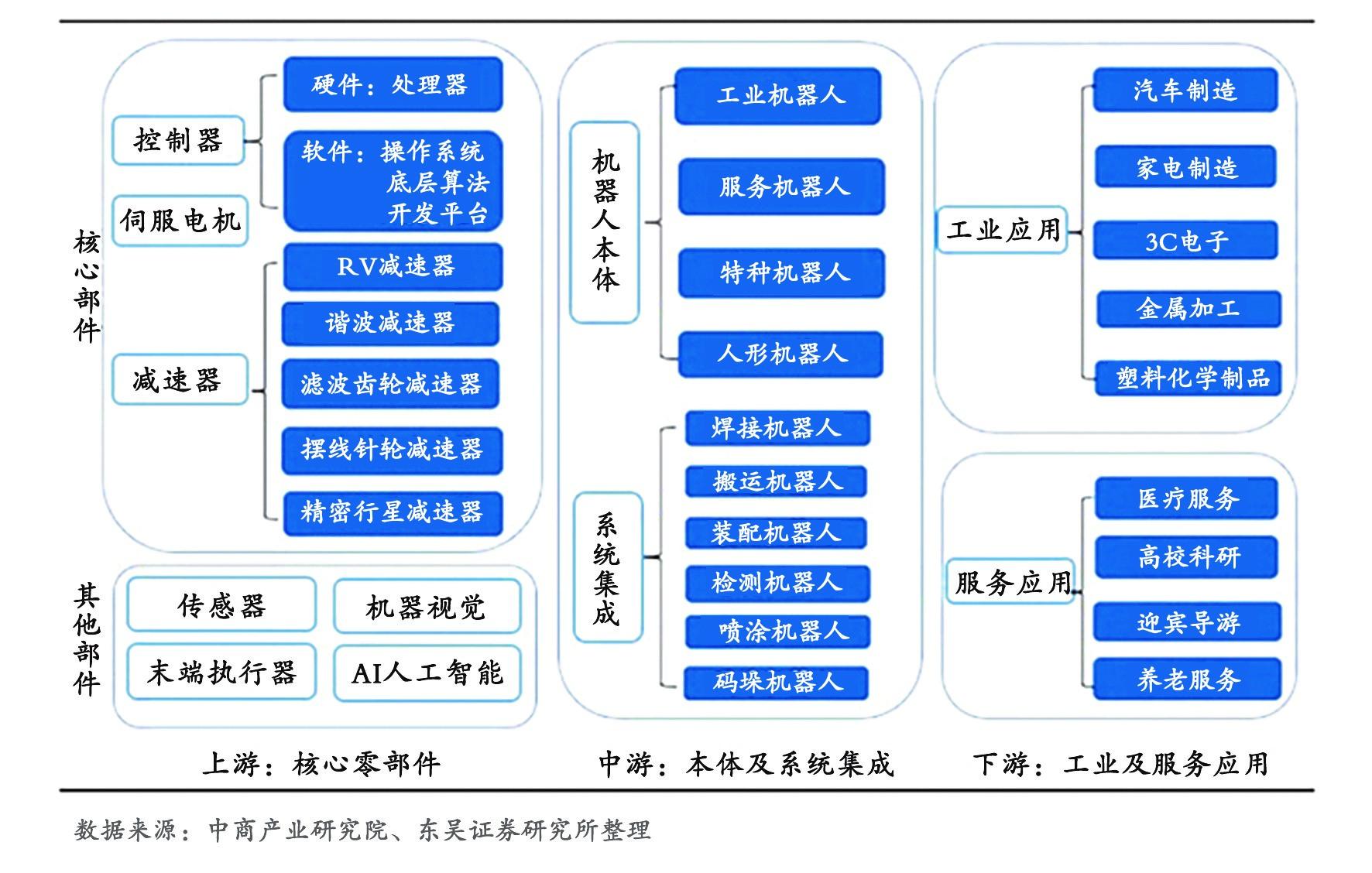 【內容摘要】: 人形機器人產業鏈可以分為上中下游三個層次:上游主要是零部件和軟件系統供應商;中游是人形機器人本體的制造商;下游則是人形機器人的終端應用市場。其中,可謂機器人核心零部件的主要包括精密減速機、交流伺服電機和控制器。同時,與機器人行動密切相關的滾珠絲杠將在各類機器人中大量使用,市場空間有望大幅提升。