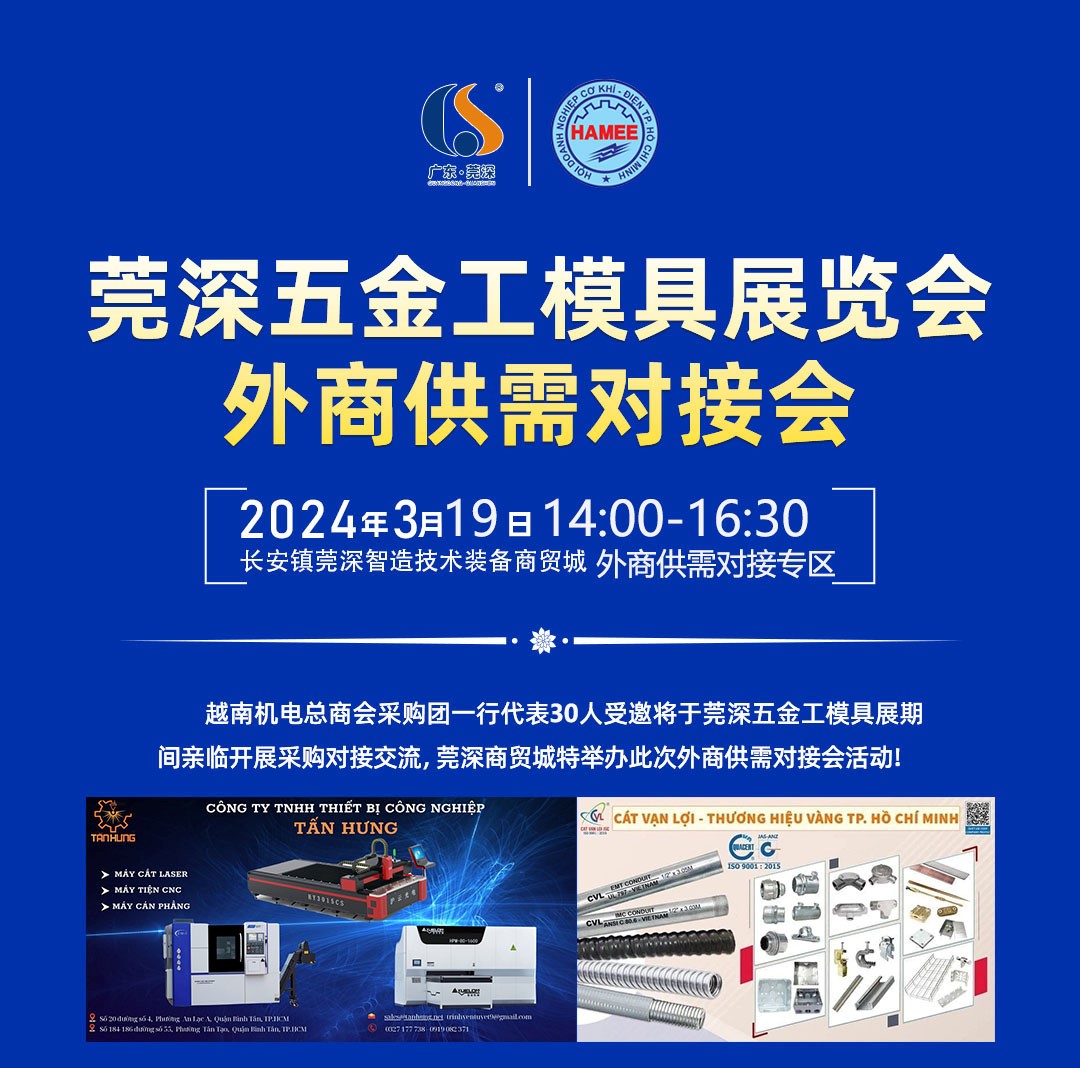 第六屆東莞長安莞深五金工模具展覽會暨2024年東莞長安機械五金模具訂貨會,定于2024年3月18-21日舉辦。為推進東莞市制造業高質量發展,順應行業客商開展國際貿易的迫切需求,2024年訂貨會擬改變思路與辦展形式,將專項特邀駐華海外客商、國外專業采購團與內地行業經銷商群體前來參觀。展會期間,擬邀請越南機電行業專業采購團及代表企業前來參加國內外貿供需對接活動,助力展會引流,提高長安鎮特色產業知名度,為長安鎮先進制造業發展注入新動能。展會目標吸納一萬名以上專業觀眾觀展,促成數億元以上交易訂單。