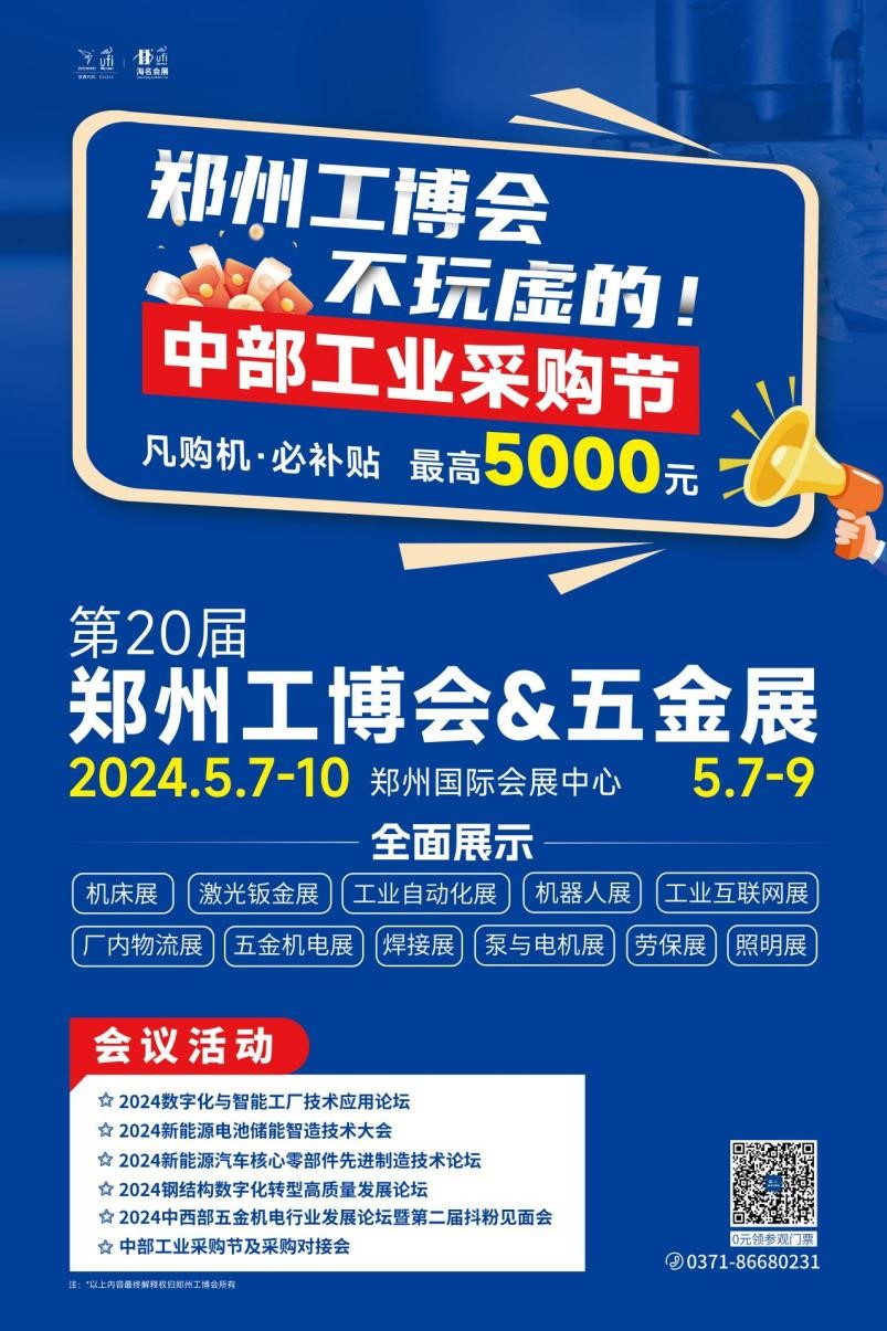 作為中西部工業品牌大展,第20屆鄭州工業裝備博覽會將于5月7日-10日在鄭州國際會展中心盛大啟幕,共設立機床展、激光鈑金展、工業自動化展、機器人展、工業互聯網展、五金機電展等六大主題展,規模近70000平方米,集結馬扎克、日本津上、臺灣崴立、邦德激光、龍雕激光、庫卡、埃夫特、匯川、臺達、西門子、世達、史丹利、得力、長城精工、博世、得偉、 英格索蘭等2500余家國內外知名企業參展,集中展示先進制造裝備、智能制造系統、數字化工廠、配套工具等產業鏈創新技術,為有設備更新換代需求的企業提供了更多的選擇。