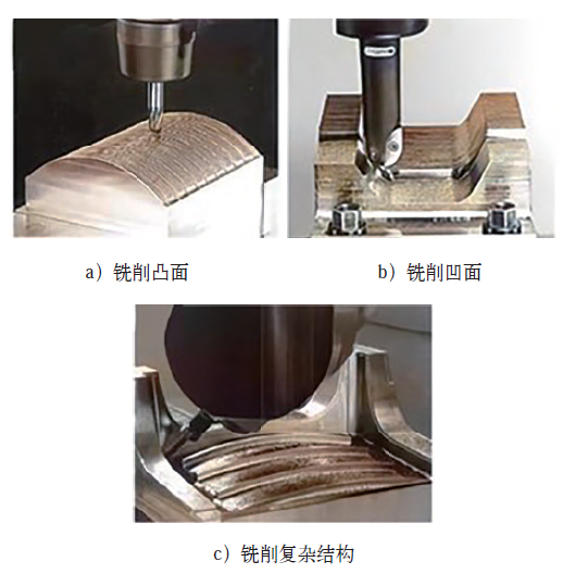 航空航天領域的高速加工技術在生產精密和復雜零件方面發揮著關鍵作用。其通過提高材料去除率和優化加工路徑,縮短了生產周期,并提高了零件的表面質量。高速銑削中,實心和可轉位球頭立銑刀在凸凹面及五軸數控銑床上加工復雜結構銑削操作如圖2所示,體現技術多樣性和復雜性。