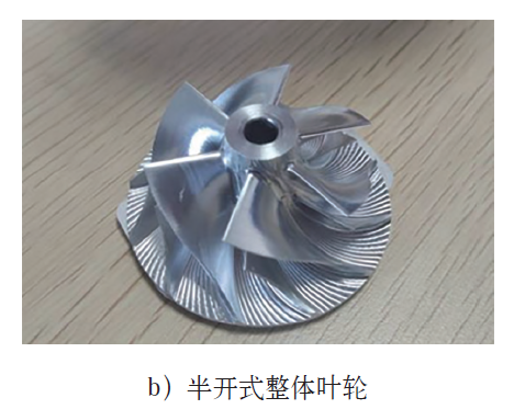 在具體的應用研究方面,FAN等開發了一種專門用于離心葉輪的五軸加工方法,該方法將葉輪分割成不同的區域,優化刀具路徑以實現精確、高效的銑削。MHAMDI等開發了航空發動機葉片Ti-6Al-4V多軸銑削動態模型,在葉片制造中實現了更好的精度和表面質量,解決了復雜的形狀和材料挑戰。陳凱航開發了一種葉輪五軸聯動數控加工的半實時速度規劃方法,有效提升了加工質量和效率,滿足了工程實際需求。以半開式整體葉輪為例,多軸聯動加工現場及樣件如圖3所示。