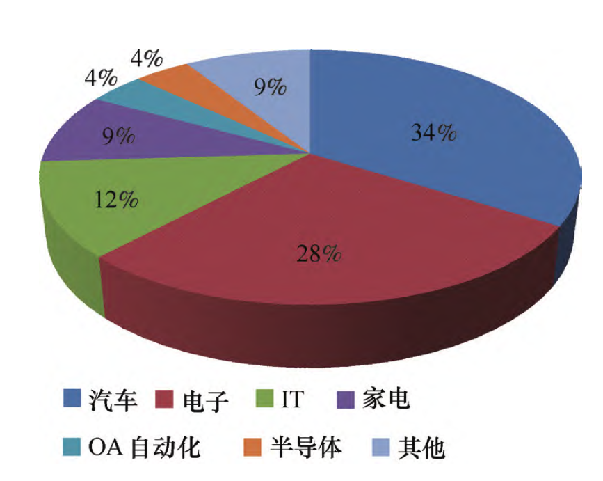 據(jù)中國模具工業(yè)協(xié)會統(tǒng)計數(shù)據(jù)顯示,目前,我國模具產(chǎn)品的主要應用領域集中于汽車、電子、IT及家電等行業(yè)。這些行業(yè)往往需要精密的工具或零部件,而模具正是為這些行業(yè)提供了一種高效、經(jīng)濟的生產(chǎn)方式。在模具應用行業(yè),汽車行業(yè)的占比最大,約為34%,電子行業(yè)約占28%,IT行業(yè)約占12%,家電行業(yè)占比9%,OA自動化及半導體分別占比4%,如圖1所示。
