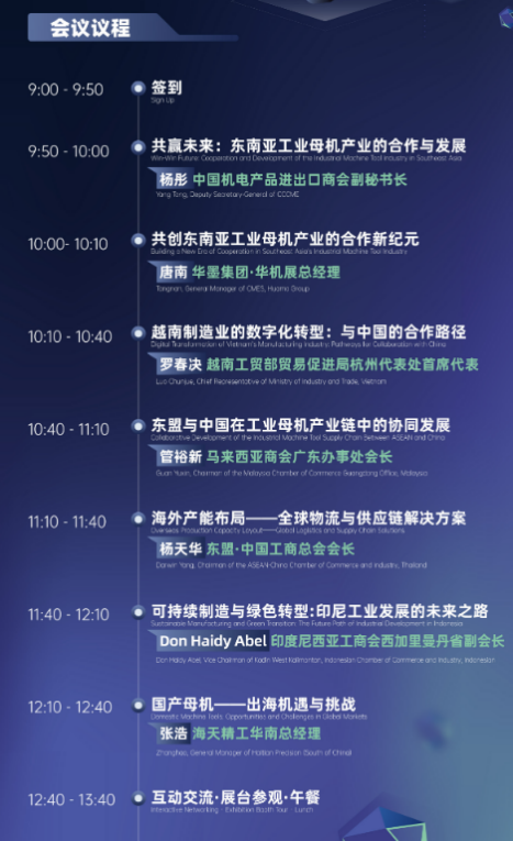 ·超重磅嘉賓:中國機電產品進出口商會副秘書長楊彤、越南工貿部首席代表羅春決、馬來西亞商會廣東辦事處會長管裕新、東盟·中國工商總會會長楊天華、印度尼西亞工商會西加里曼丹省副會長Don Haidy Abel、華墨集團·華機展總經理唐南、海天精工華南總經理張浩