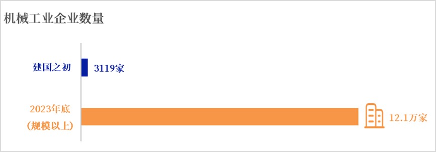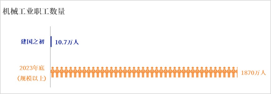 新中國成立之初,機械工業企業數量為3119家,此后數量持續增加,多種所有制經濟共同發展。截至2023年末,機械工業規模以上企業(主營業務收入2000萬元以上)數量已達到12.1萬家,約占全國工業規模以上企業數量的四分之一。職工人數由1949年的10.7萬人,增至2023年規模以上企業從業人員約1870萬人,累計增長174.8倍,占全國工業職工人數的24.1%。資產總額由1995年有記錄以來的1.67萬億元,提高至2023年的36萬億元,累計增長21.6倍,年均增長11.6%。