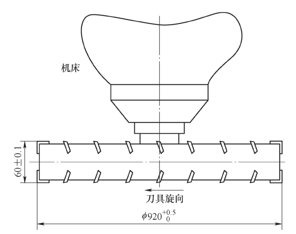 在大型機(jī)械零件加工中,為了提高生產(chǎn)效率,常采用大直徑刀具,一次性完成工件表面的加工。某用戶在加工一大型零件時, 要求采用D920mm×60mm大規(guī)格槽銑刀,一次性完成工件相關(guān)槽面的加工,如圖1、圖2所示。用戶根據(jù)其專用機(jī)床功率、刀具裝夾情況等,要求所設(shè)計加工的D920mm×60mm槽銑刀,成品總質(zhì)量不超過180kg。若按一般減輕刀體質(zhì)量的設(shè)計方法,很難達(dá)到用戶要求。筆者優(yōu)化相關(guān)設(shè)計參數(shù),采用輪轂型減重孔排列,進(jìn)行減重設(shè)計,減重效果好,滿足了用戶要求。