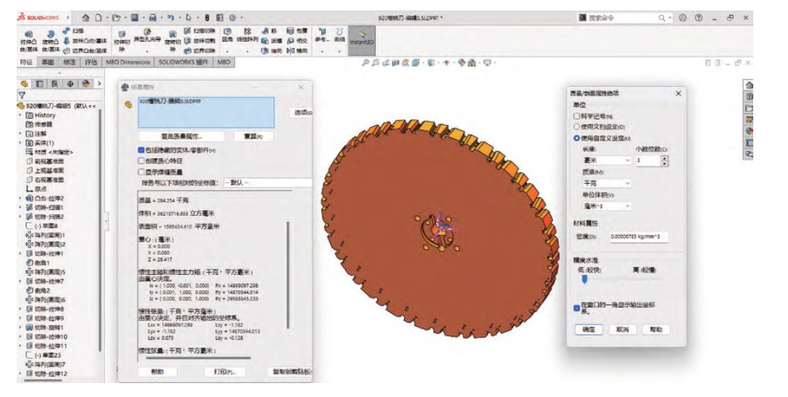 根據(jù)所設(shè)計刀體槽形及安裝孔等參數(shù),利用Solidworks繪制出刀體立體圖,再利用Solidworks軟件的質(zhì)量查詢功能,可方便得到刀體質(zhì)量。