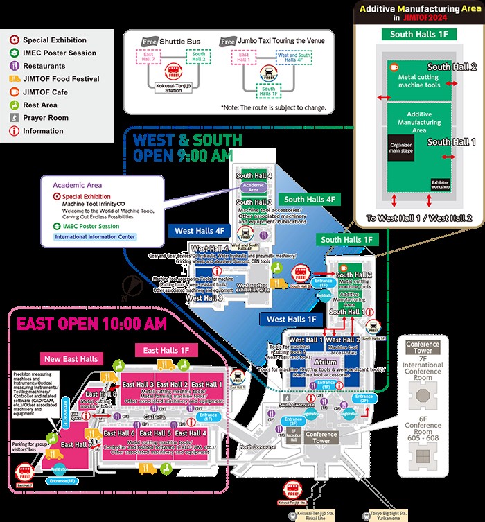 JIMTOF2024展會的展覽面積是118540m2(本屆展會使用東、西、南館),成為JIMTOF有史以來最大規模的一屆展會。其中,南館為新啟用的展館,主要展示部件、系統、增材制造展區、學校成果展、學生招聘區和國際協會區等,也作為開幕式的舉辦場地;東館主要是展示機床主機及相關部件;西館主要是展示切削刀具、磨料磨具、部件及軟件等。