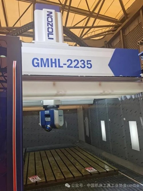 國產機床配置國產五軸銑頭的應用場景也正在逐漸擴大。代表展品如上海諾倬力機電科技有限公司的重型橋式五軸龍門中心GMHL-2235,整體布局采用高架橋式龍門形式結合“箱中箱結構”,搭配高精度雙臂五軸銑頭,實現五軸聯動的曲面加工和流線型加工,A軸旋轉范圍達到±110°,C軸旋轉范圍達到±360°。