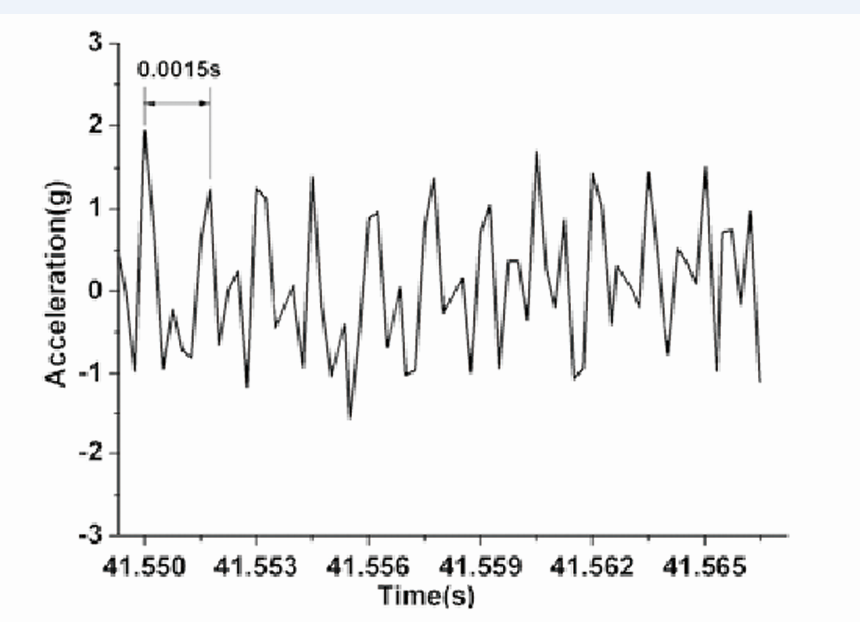 可以看到,由于加工過程中的振動主要由銑刀銑削時的銑削力引起的,而且加工過程中的振動主要是受迫振動,所以加速度的變化具有以下規律:高峰-低峰-高峰-低峰。而且經過分析,相鄰兩加速度高峰之間的時間間隔約為1.5ms,這與計算得到的刀齒通過周期(T= 60/(N*n)=0.0015s)一致,說明振動監測模塊正常運行。