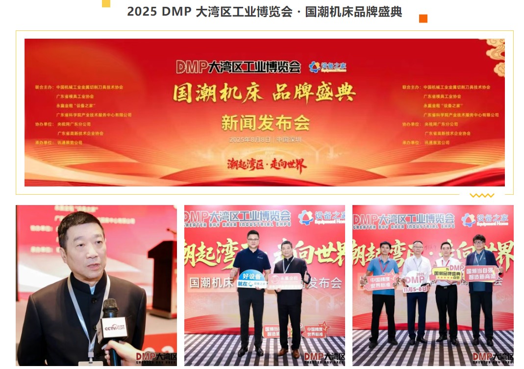 2025 年 8 月 8 日,2025 DMP 大灣區工業博覽會?國潮機床品牌盛典新聞發布會在深圳國際會展中心皇冠假日酒店會展灣宴會廳隆重舉行。本次盛會由中國機械工業金屬切削刀具技術協會、廣東省模具工業協會、永贏金租“設備之家”、廣東省科學院產業技術服務中心有限公司聯合主辦;央視網廣東分公司、廣東省高新技術企業協會協辦;訊通展覽承辦,以“賦能產業升級,共筑國潮新未來”為核心,通過一系列全新重磅舉措,為大灣區乃至全國的機床產業注入全新動能。