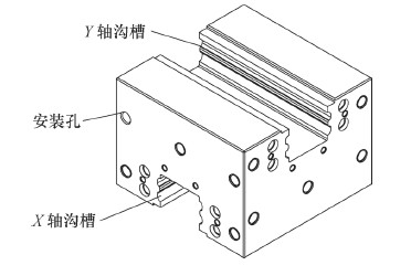 本文所描述的十字交叉導軌副同樣具有導軌、滑塊及滾動體。其中X軸與Y軸同時配置了兩根導軌,并且具有相同的橫截面。從圖3可見,滑塊體為長度及寬度相同的六面體,其中在4個側面分別設計有用于聯接安裝板的螺紋孔以及用于安裝返向器的螺紋孔,其余上下兩個面設計有互相垂直的兩組溝槽用于與導軌及滾動體配合滾動,可實現X、Y兩個方向同時移動。導軌、返向器及滾動體等零件與常規的同規格導軌副零件相同,可減少重新開發成本。為了實現不同品牌之間的導軌副互換,滑塊體的外形及安裝孔必須要按照現有的要求進行設計。
