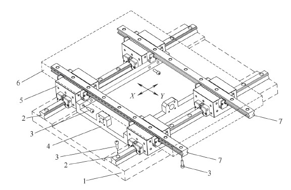 1—安裝底座 2—X軸導軌 3—螺釘 4—聯接板 5—滑塊 6—工作臺 7—Y軸導軌