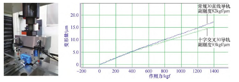 根據行業標準中的定義,靜剛度是指滾動直線導軌副抵抗變形的能力(單位變形所需要的載荷)。華中科技大學的方健等也研制了一種滾動直線導軌副靜剛度試驗臺,通過計算機來完成相關測試和控制。對于十字交叉導軌副其試驗方案大體相似,具體檢測數據如圖5所示。試驗采用本文所述的十字交叉導軌副及常規的直線導軌副進行靜剛度測試對比,通過測試數據可見,在相等規格、相同預緊力及相同的負載條件下,十字交叉導軌副的靜剛度較常規的直線導軌副提升13%左右。