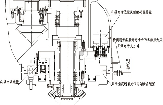 回轉(zhuǎn)體是數(shù)控萬能銑頭的關(guān)鍵核心零件之一,回轉(zhuǎn)體為鑄鐵件,內(nèi)部結(jié)構(gòu)詳見圖2。回轉(zhuǎn)體內(nèi)裝有A軸轉(zhuǎn)角的機(jī)械驅(qū)動裝置和相應(yīng)的傳動裝置,裝有用于A軸精確定位的端齒盤裝置、A軸端齒盤脫開與嚙合的位置檢測無觸點(diǎn)開關(guān)、用于A軸旋轉(zhuǎn)而配置的液壓油缸、A軸夾緊油缸及彈簧組件以及A軸旋轉(zhuǎn)用的液壓密封元件等零部件。