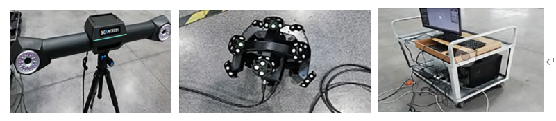 激光掃描設備由跟蹤器、球形掃描頭、數據處理設備組成,如圖1所示,掃描前對設備進行預熱和儀器精度校準,掃描后刪除非連接項和孤立點,進行點云網格化,最后輸出網格(STL)文件,并導入理論數據,進行擬合比對。