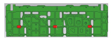 (1)左中右支撐下的自重變形。圖6所示為左中右6點全部支撐下的模具墊塊支撐設置,通過設置不同墊塊支撐來計算模具自重引起的變形量。